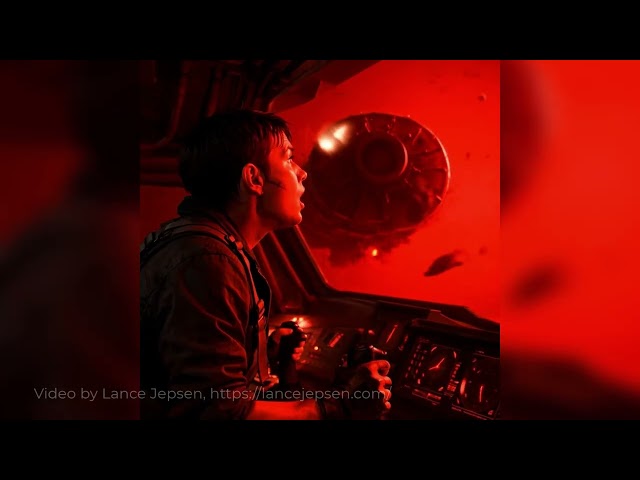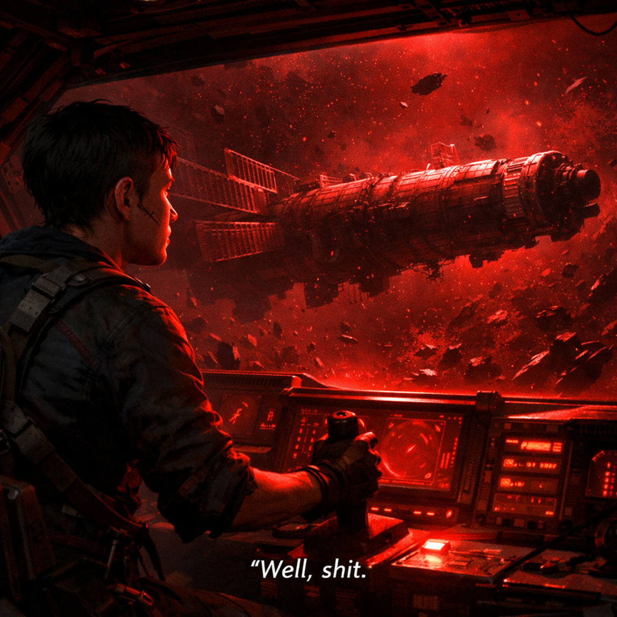 She cuts thrust and lets herself drift closer, guiding the ship carefully through a field that could tear her apart in seconds. The cockpit floods red as emergency lights kick in.