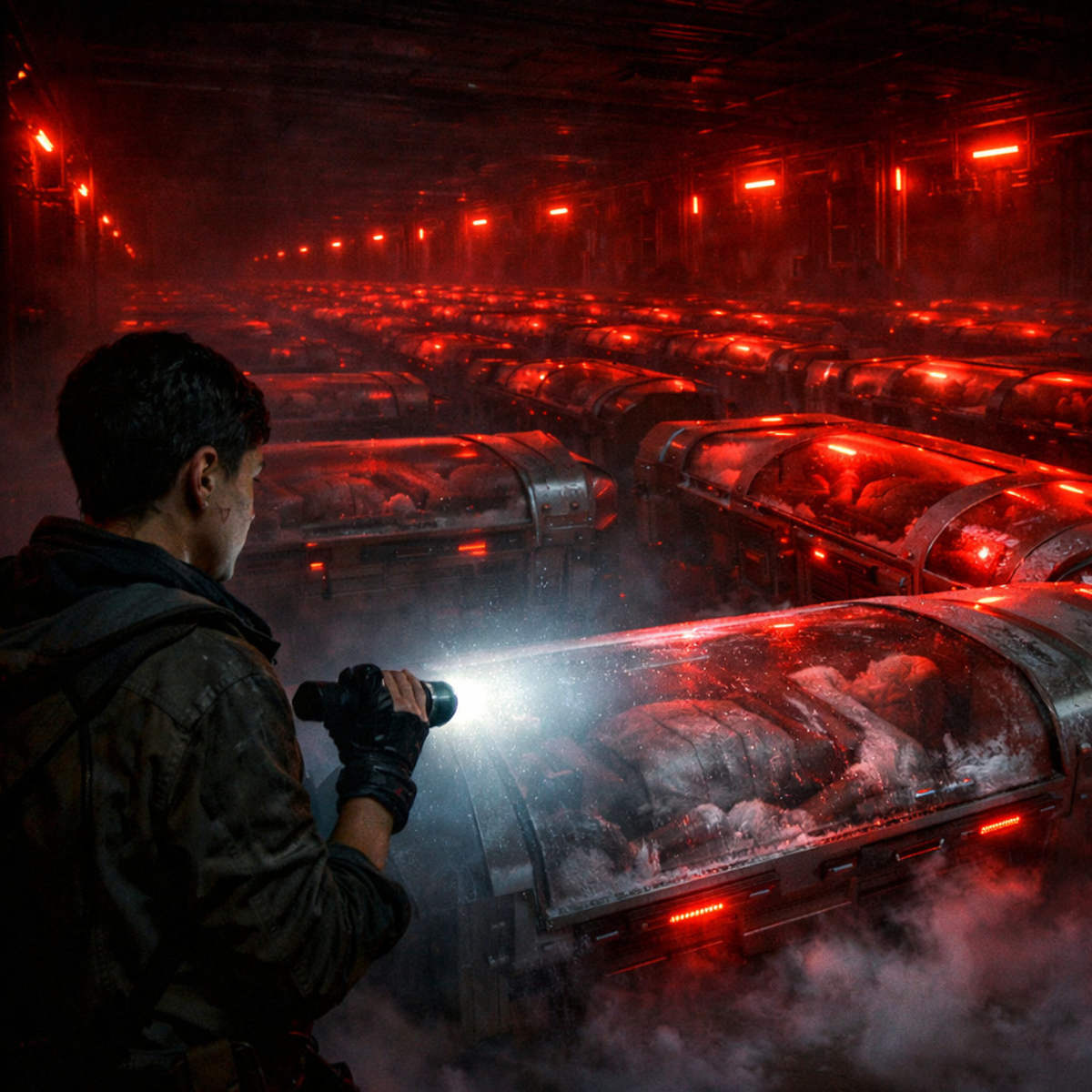She stepped through and stopped dead. Her light caught only the nearest edge of what stretched before her—row after fucking row of preservation pods vanishing into darkness. Emergency strips leaked anemic red glow across the chamber, turning thousands of glass-fronted coffins into a bloodbath tableau. Corporate efficiency in perfect grid formation.